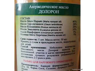 Входящие в состав масла Долорон вытяжки из трав и плодов Гималайского хребта обладают противовоспалительным и обезболивающим действием.