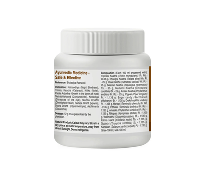 Махатрифаладья Гхрита – уникальный аюрведический продукт для заботы о здоровье глаз, который может быть использован как для внутреннего, так и наружного потребления. Препарат позволяет значительно улучшить зрение, устраняет глазные инфекции, нейтрализует аллергические реакции глаз, регулирует внутриглазное давление, замедляет развитие дегенеративных заболеваний глаз.