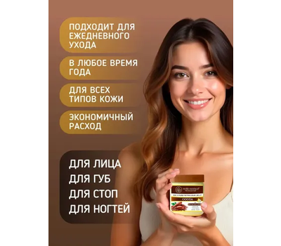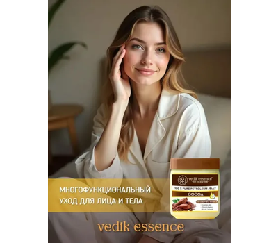Почему выбирают Vedic Essence? Интенсивное питание благодаря маслу какао Глубокое увлажнение с витамином Е Натуральный состав без вредных добавок Универсальное применение для всех типов кожи Длительный эффект увлажнения Преимущества продукта: Масло какао обеспечивает насыщенное питание кожи, восстановление защитного барьера, смягчение даже самых сухих участков, антиоксидантную защиту. Витамин Е в составе защищает от преждевременного старения, усиливает регенерацию клеток, улучшает эластичность кожи, способствует заживлению Область применения: Уход за сухой и чувствительной кожей Восстановление поврежденной кожи Защита от обветривания Уход за губами и кутикулами Питание кожи рук и ног Вазелин Vedic Essence становится настоящим спасением в те моменты, когда кожа требует особого внимания. После принятия душа или ванны он нежно обволакивает кожу, словно создавая невидимую вуаль, которая удерживает драгоценную влагу внутри. В холодные дни года этот удивительный продукт превращается в надёжного защитника, оберегая нежную кожу от суровых погодных условий. А перед сном он становится настоящим эликсиром восстановления, помогая коже обновиться во время отдыха. Особую любовь продукт заслужил среди тех, кто заботится о красоте своих губ. Он предотвращает появление трещин и обветривания, даря губам мягкость и ухоженный вид.